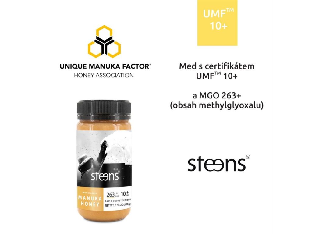Steens Manuka Honey je raw nepasterizovaný pravý manukový med z Nového Zélandu. Pochází od včel opylujících Balmín metlatý, keř s bílorůžovými květy pocházející původně z Austrálie a Zélandu, kde mu původní domorodé maorské kmeny daly název Manuka. Med z květů Manuky má výjimečný výživový profil - obsahuje celé spektrum enzymů, aminokyselin, antioxidantů, vitamínů, minerálů a dalších látek s velmi zajímavými vlastnostmi. Manukový med je také známý jako chuťově výraznější, bohatší a plnější než jiné medy. Je to dáno velmi vysokou koncentrací účinných látek.